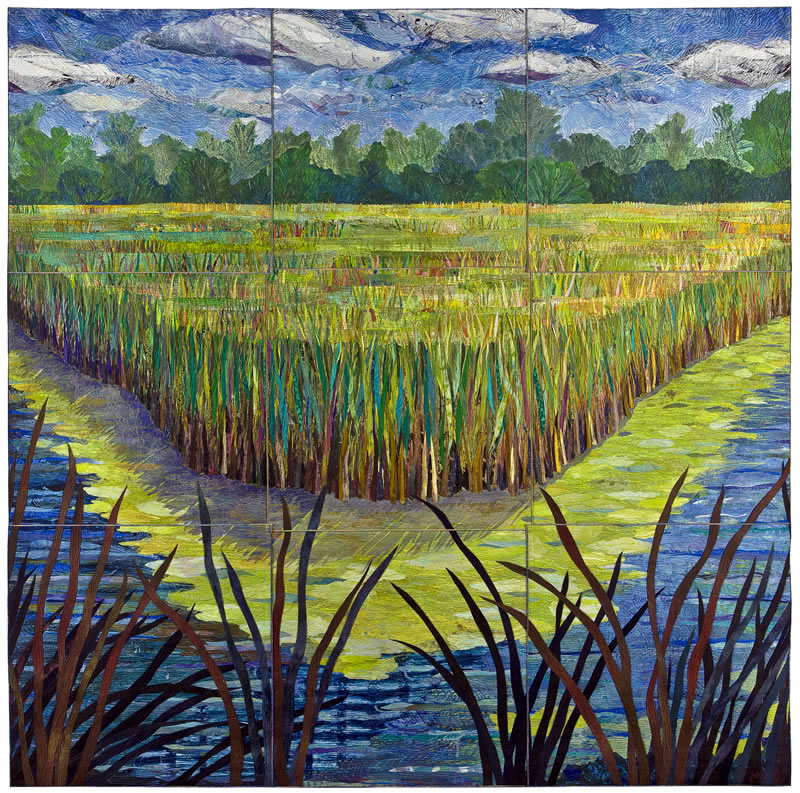 Top: Wisconsin Wetlands II River Bend (2007). Sue Benner, www.SueBenner.com. Silk, cotton, found fabrics, dye and paint, fused, mono-print, machine-quilted. 83 1/2″ x 83 1/2″. Collection of John M. Walsh, III. Photo by Gregory Case.